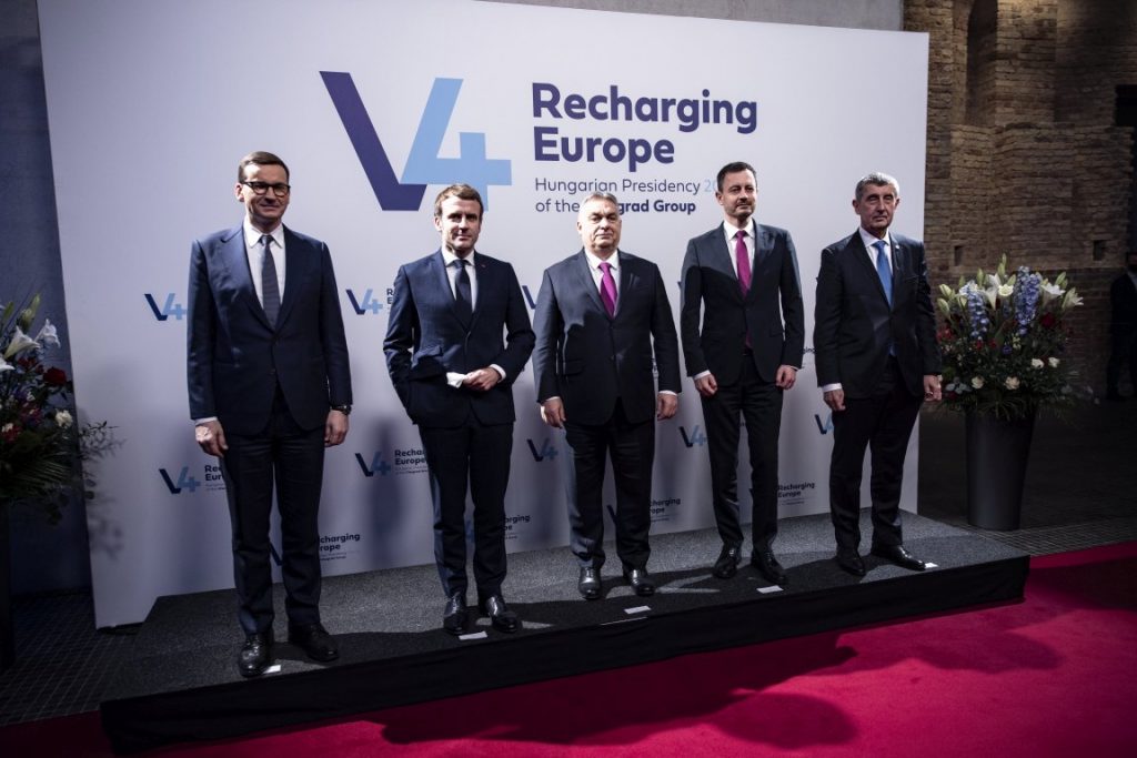 Mateusz Morawiecki lengyel miniszterelnök, Emmanuel Macron francia köztársasági elnök, Orbán Viktor magyar és Eduard Heger szlovák miniszterelnök, valamint Andrej Babis cseh ügyvezetõ kormányfõ (b-j) a francia elnök és a visegrádi országok (V4) miniszterelnökeinek csúcstalálkozóján Budapesten.