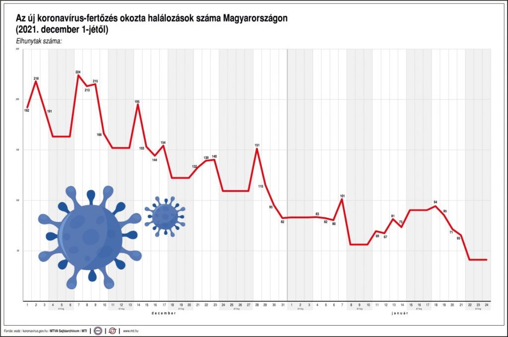 Magyarországon a beoltottak száma 6 342 496, közülük 6 080 592-en a második, 3 554 502-en pedig már a megerősítő harmadik oltást is megkapták. Az elmúlt három napban 39 928 új fertőzöttet igazoltak, ezzel a járvány kezdete óta 1 441 385-re nőtt az azonosított fertőzöttek száma. Az elmúlt három napban meghalt 122, többségében idős, krónikus beteg, így az elhunytak száma 40 944-re emelkedett – közölte a hétvégi összesített adatokat a koronavirus.gov.hu hétfőn. A kormányzati portálon azt írták: a gyógyultak száma folyamatosan nő, jelenleg 1 209 129, az aktív fertőzöttek száma pedig 191 312-re emelkedett. Kórházban 2921 koronavírusos beteget ápolnak, közülük 176-an vannak lélegeztetőgépen.