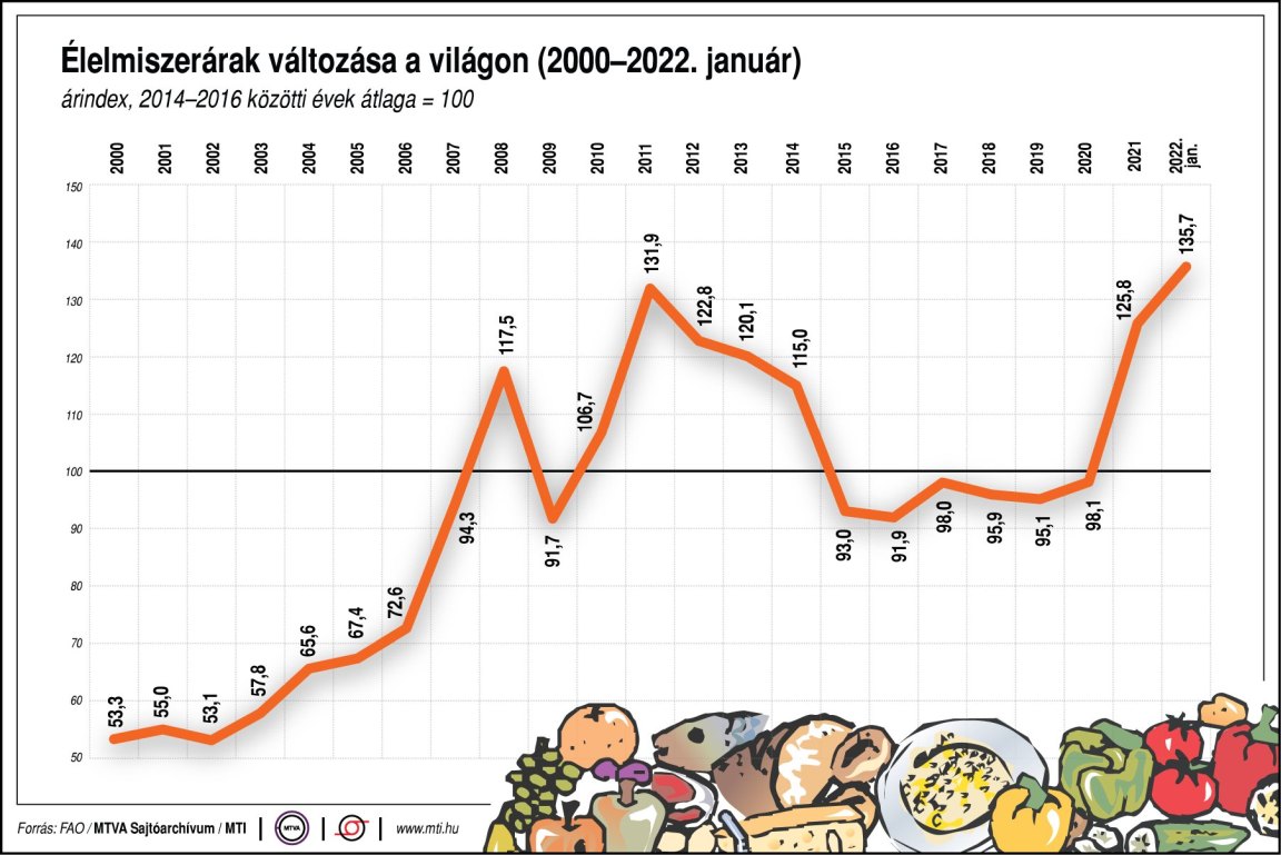 Elsősorban a növényi olajok és a tejtermékek drágulása nyomán közel 10 éves csúcson álltak az élelmiszerárak a világon januárban. Az ENSZ Élelmezésügyi és Mezőgazdasági Szervezete (FAO) által csütörtökön ismertetett adatok szerint a januári árindex 135,7 pont lett, 1,1 százalékkal (1,5 ponttal) meghaladva a decemberit. A FAO élelmiszerár-indexe kereskedelemmel súlyozott mutató, amely az öt legfontosabb élelmiszer-alapanyag – növényi olajok, szemestermények, húsfélék, tejtermékek és cukor – nemzetközi piaci árát veszi figyelembe.
