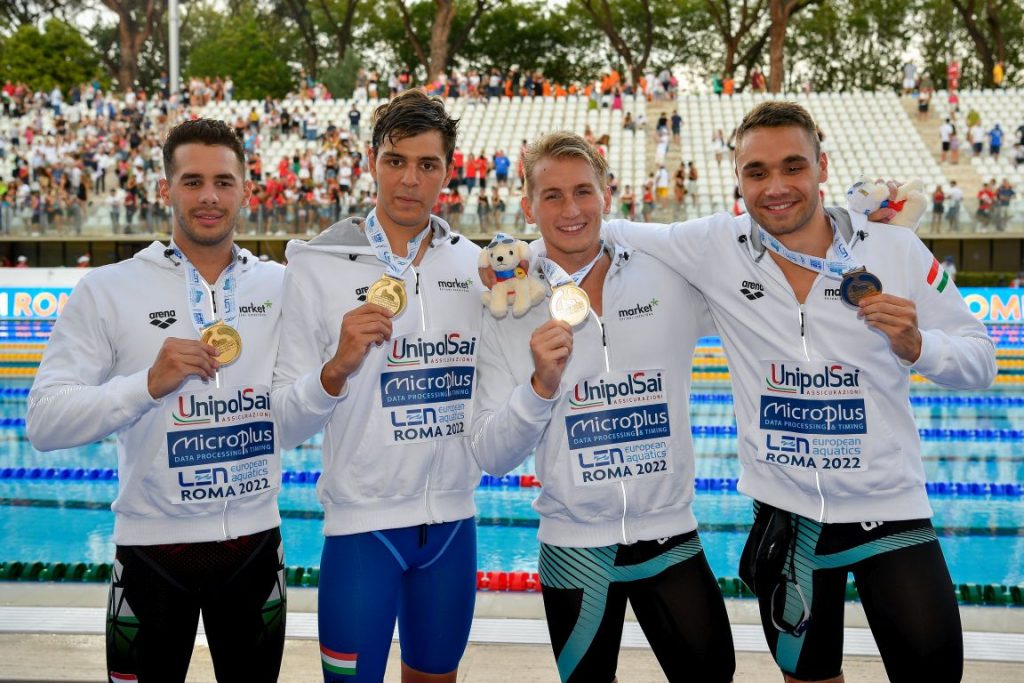 A Németh Nándor, Márton Richárd, Holló Balázs, Milák Kristóf összeállítású 4×200 méteres magyar férfi gyorsváltó országos csúccsal aranyérmet nyert a római úszó Európa-bajnokság csütörtöki nyitónapján. Ez a magyar úszósport történetének 100. aranyérme a kontinensviadalokon.